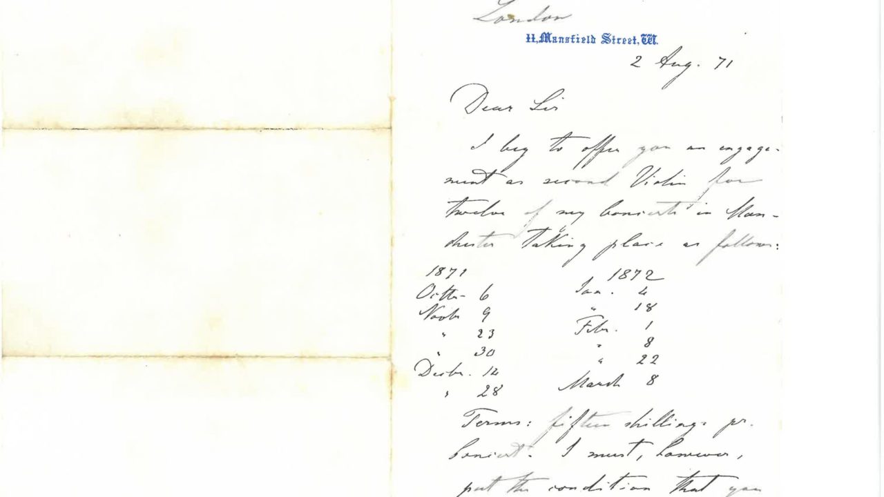 Back in 1871, Charles Hallé requested the services of second violin Mr G Nelson for twelve concerts in Manchester, including 4th January. He was offered 15 shillings per concert, which is around £480 in today’s money, with the stipulation that he does not play the Saturday evening concerts. There is no indication as to why that would be, but given that Mr Nelson is listed amongst the orchestra for the 4th of January playing in ten different pieces programmed, we can only assume he accepted the terms from Charles Hallé.